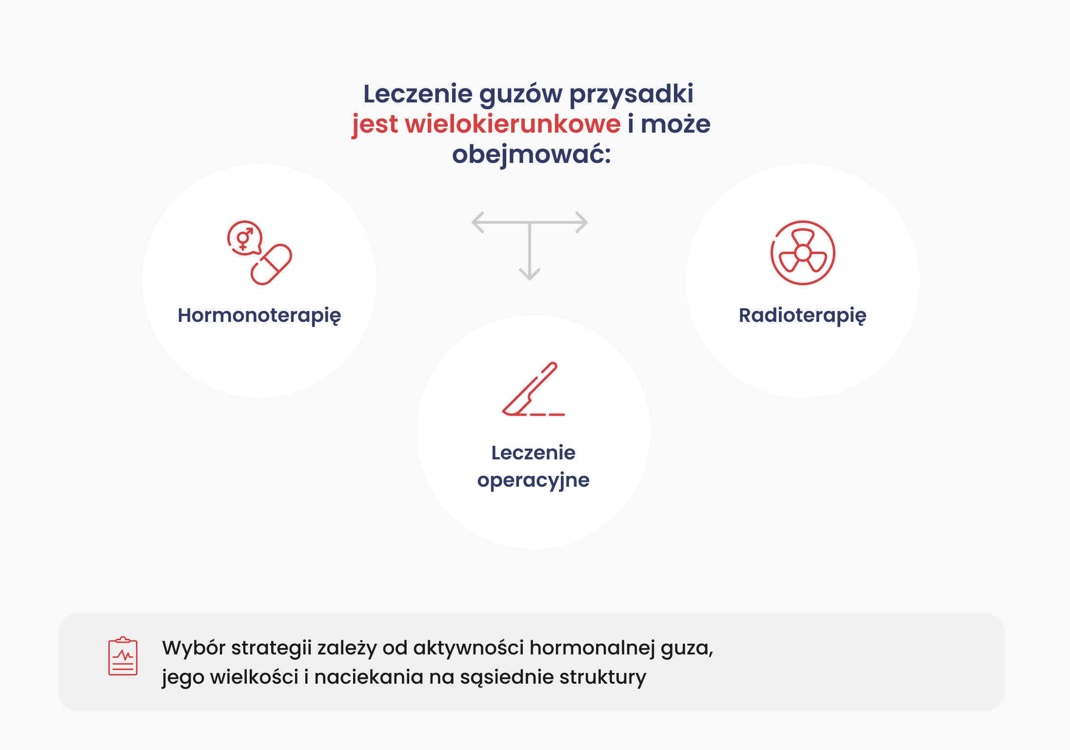 Leczenie operacyjne guzów przysadki najczęściej przeprowadza się z dostępu przez przewód nosowy i zatokę klinową. Zazwyczaj wykorzystuje się endoskopy sztywne o średnicy 3–4 mm z obrazowaniem w jakości HD, co umożliwia precyzyjne odróżnienie guza od zdrowej tkanki i bezpieczne usunięcie go przy zachowaniu nienaruszonych struktur nerwowych oraz naczyniowych. Tą metodą operuje się obecnie do 95 % chorych.