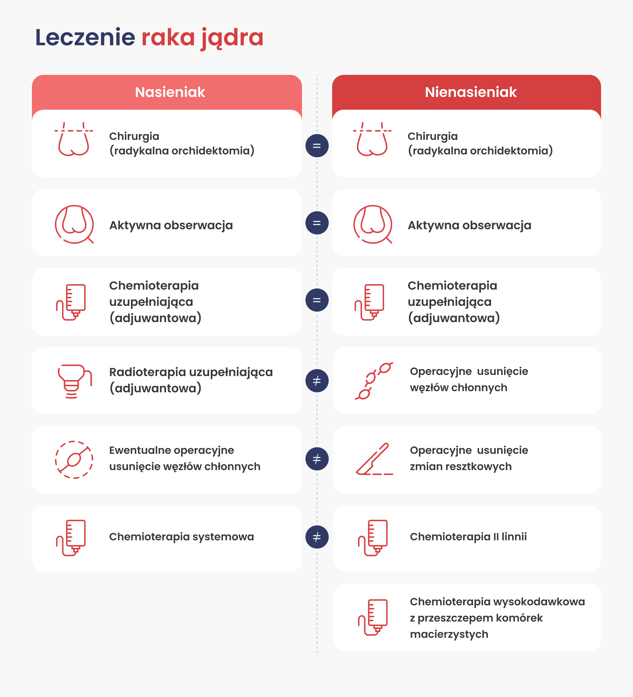 Leczenie nowotworów jądra różni się w zależności od tego, czy rozpoznany guz jest nasieniakiem czy nienasieniakiem. Nasieniaki są zwykle mniej agresywne i bardzo odpowiadają na radioterapię i chemioterapię, natomiast nienasieniaki częściej przebiegają dynamicznie i wymagają bardziej złożonego postępowania. Prawidłowa klasyfikacja histopatologiczna guza oraz ocena stopnia zaawansowania są kluczowe dla wyboru optymalnego planu leczenia i rokowania.