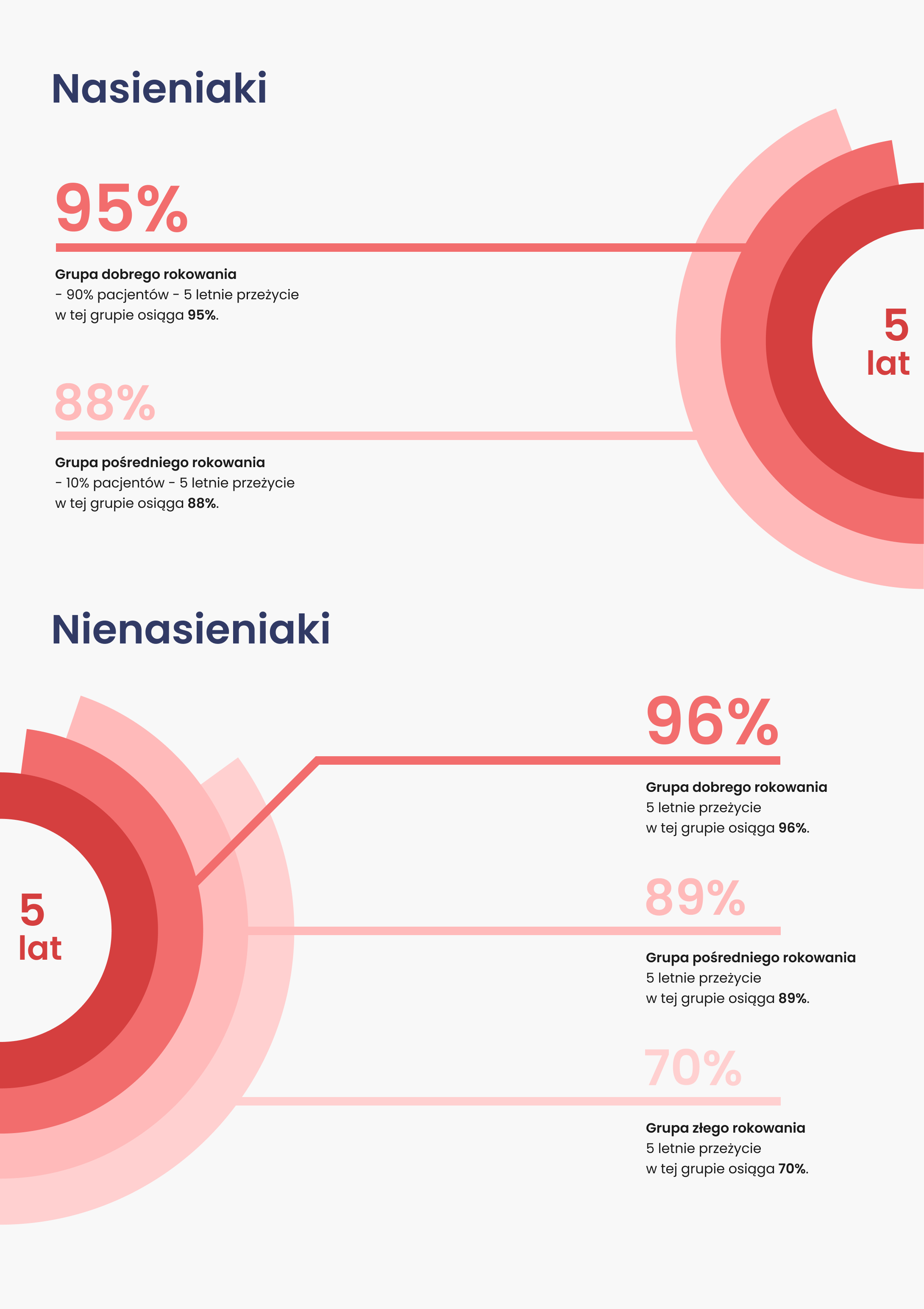 - Grupa złego rokowania - pacjent jest klasyfikowany do tej grupy, jeśli spełnia jeden z poniższych warunków: guz pierwotny jest zlokalizowany w śródpiersiu, obecność przerzutów w narządach innych niż płuca (np. wątroba, kości, mózg), bardzo wysokie stężenia któregokolwiek z markerów nowotworowych. Ta grupa stanowi największe wyzwanie terapeutyczne, ale i tu postęp jest ogromny. Dzięki nowoczesnemu leczeniu, 5-letnie przeżycie w tej grupie wynosi niecałe 70%. Należy pamiętać, że "5-letnie przeżycie" to statystyczna miara sukcesu leczenia, a nie granica długości życia – wielu pacjentów żyje znacznie dłużej, wracając do pełni zdrowia.