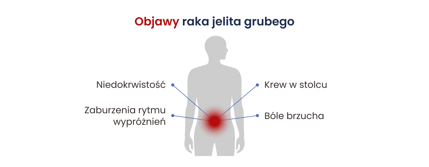 Rak jelita grubego we wczesnym stadium zaawansowania zazwyczaj rozwija się powoli i bezobjawowo. Pierwszym sygnałem rozwijającej się choroby są często: ogólne osłabienie, męczliwość i obecność krwi w stolcu. Następnie pojawiają się bóle podbrzusza, problemy z wypróżnianiem (zmiany rytmu, zaparcia, biegunki, parcie, itp.) i niezamierzone chudnięcie.