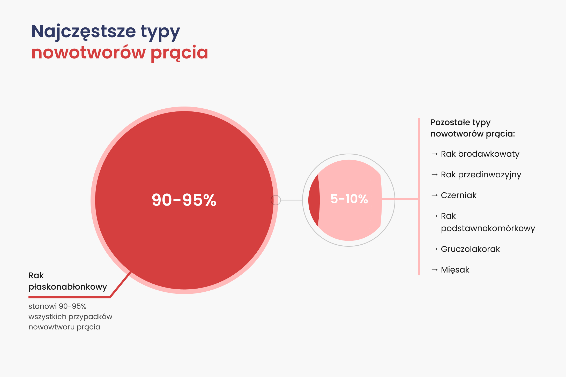 - rak płaskonabłonkowy (SCC - squamous cell cancer) to najczęstszy typ nowotworu prącia stanowiący około 90-95% przypadków. Rozwija się w dowolnym obszarze prącia w komórkach skóry zwanych komórkami płaskonabłonkowymi. Większość tych nowotworów rozpoczyna się w napletku lub żołędzi penisa. Guzy te charakteryzują się powolnym wzrostem, a wykryte na wczesnym etapie, zazwyczaj są wyleczalne.