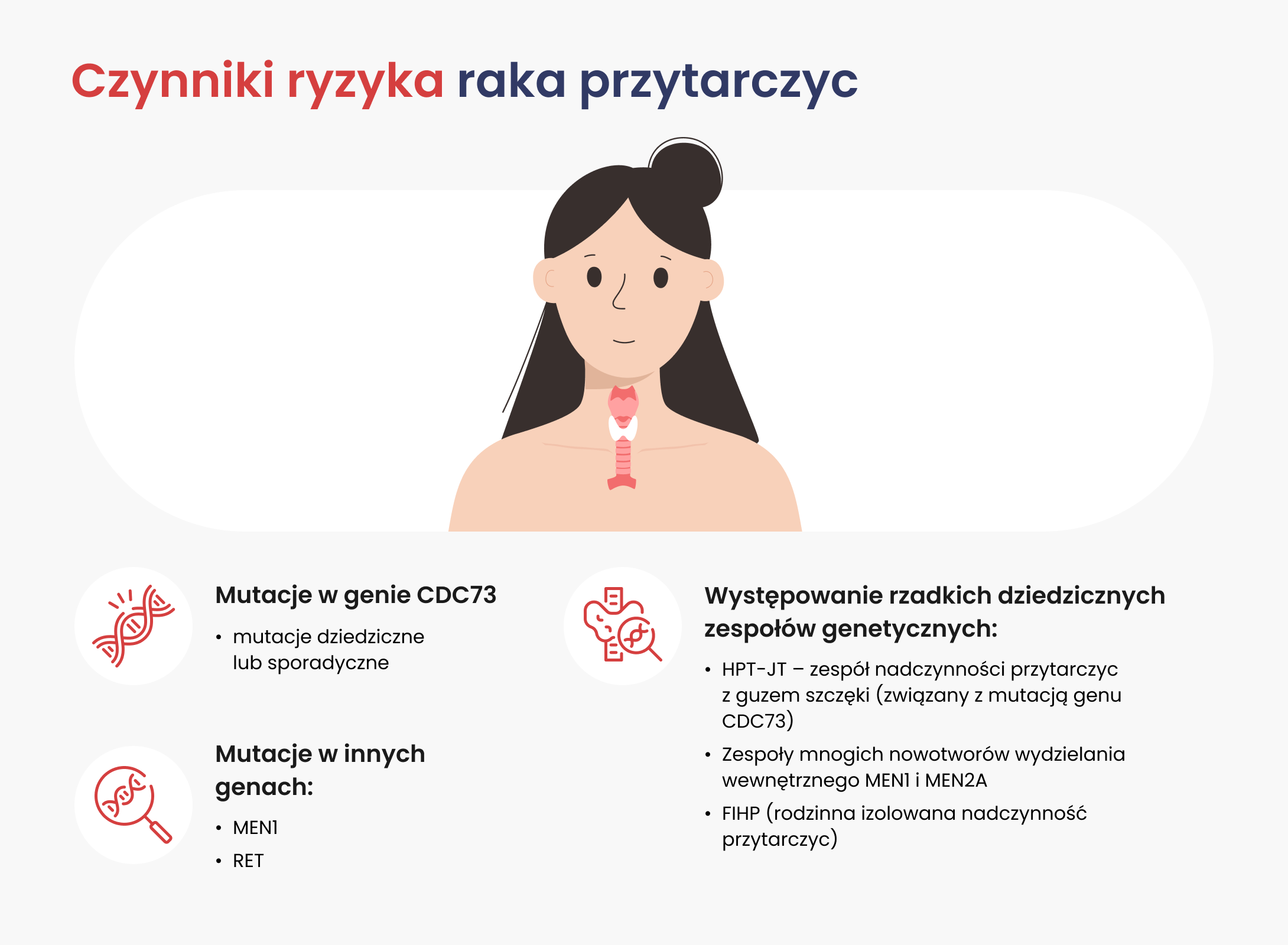 Najważniejszym i najlepiej poznanym czynnikiem ryzyka rozwoju raka przytarczyc jest występowanie rzadkich, dziedzicznych zespołów genetycznych. Pacjenci z tymi schorzeniami powinni być pod szczególną obserwacją.