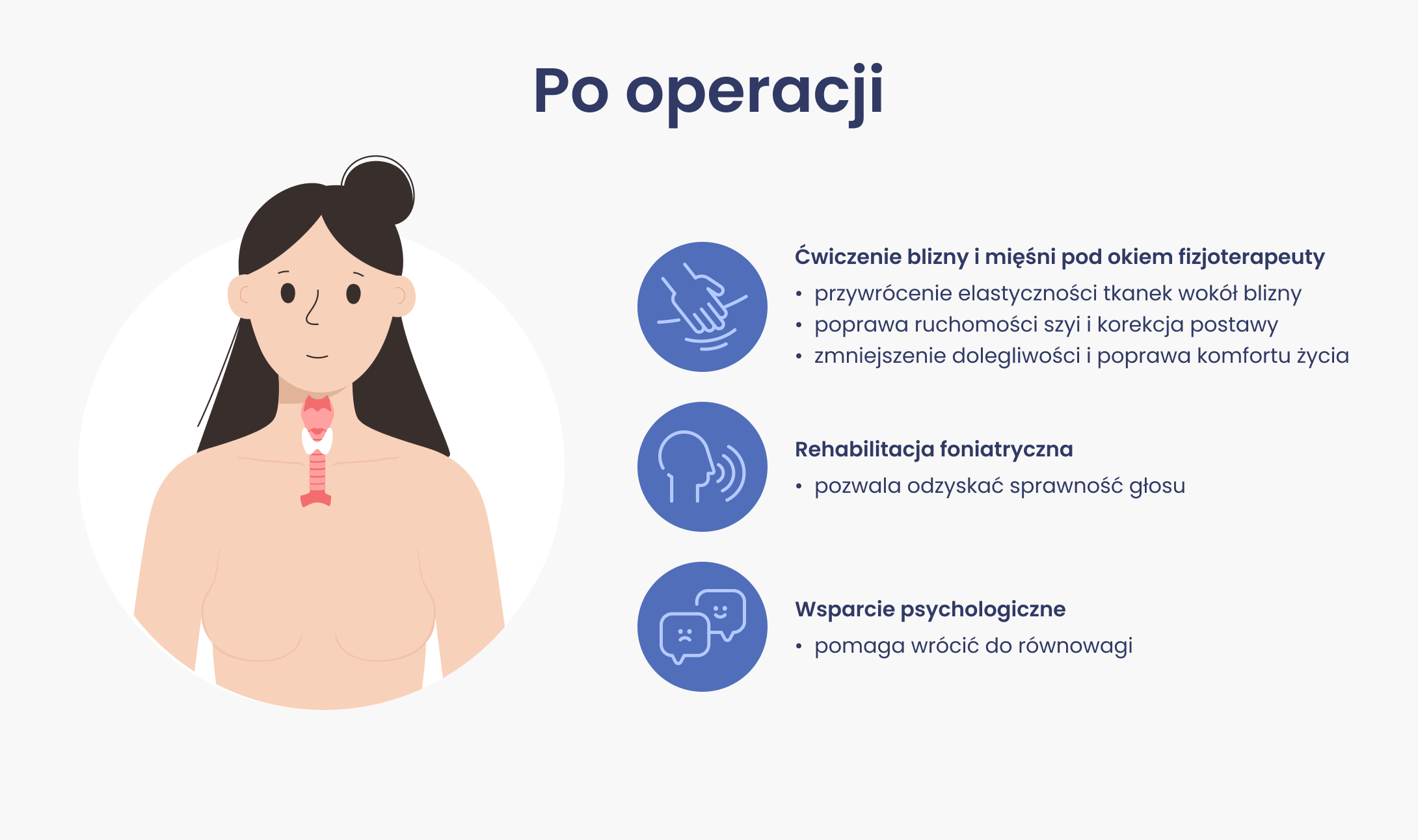 Operacja w obrębie szyi może też uszkodzić nerwy krtaniowe, co powoduje chrypkę lub zmianę barwy głosu. W takich przypadkach pomocna jest rehabilitacja foniatryczna, która pozwala odzyskać sprawność głosu.