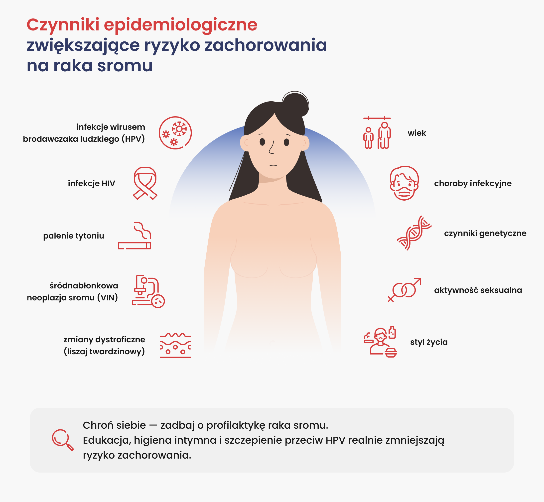 Rak sromu rozwija się pod wpływem różnych czynników, zarówno infekcyjnych, genetycznych, jak i związanych ze stylem życia. Do najważniejszych należą: infekcje wirusem HPV, HIV, palenie papierosów, przewlekłe zmiany skórne w okolicach intymnych oraz niektóre mutacje genetyczne. Ryzyko zachorowania rośnie wraz z wiekiem, a najwyższy odsetek zachorowań obserwuje się między 70. a 80. rokiem życia. Świadomość tych czynników oraz odpowiednia profilaktyka – higiena, szczepienia przeciw HPV i regularne kontrole – mogą znacząco zmniejszyć ryzyko rozwoju choroby.