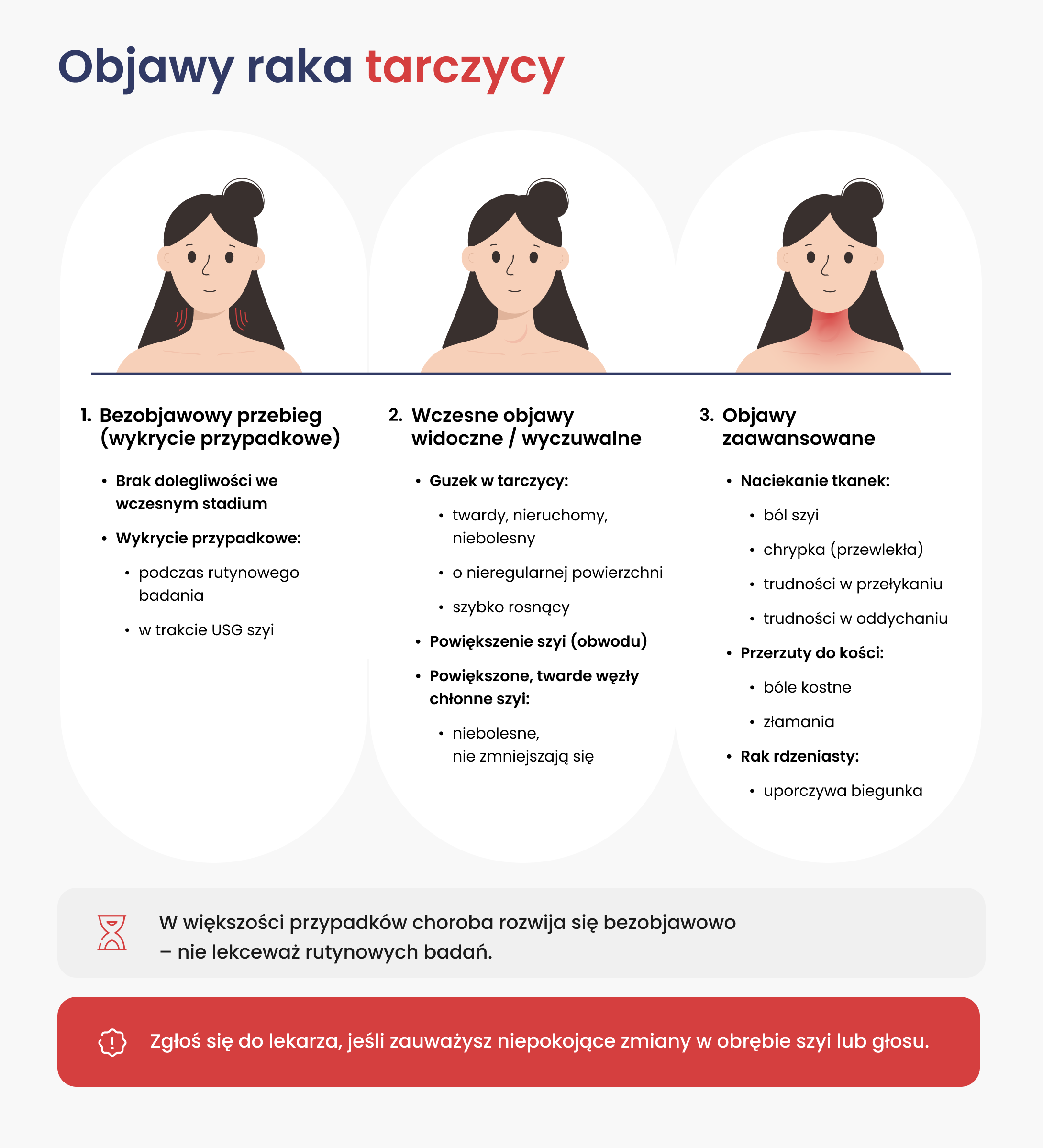 Rak tarczycy często nie daje żadnych objawów, zwłaszcza we wczesnym stadium, co sprawia, że wiele osób nie odczuwa żadnych dolegliwości. Choroba bywa w takich przypadkach wykrywana przypadkowo – na przykład podczas rutynowego badania szyi przez lekarza lub w trakcie wykonywania USG.