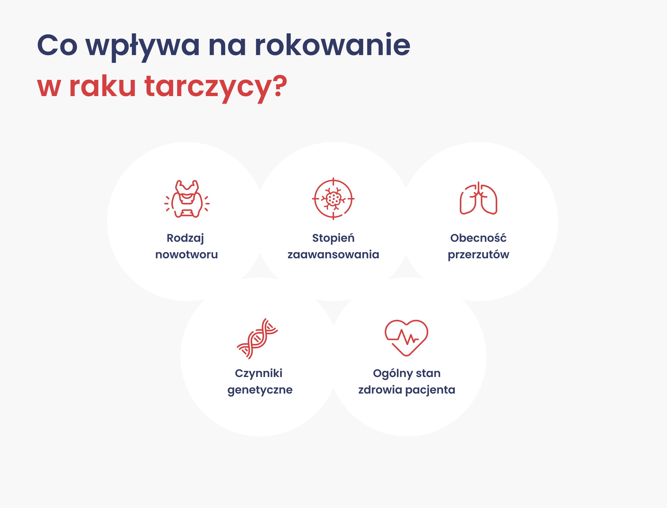 - rodzaj raka – nowotwory zróżnicowane (brodawkowaty, pęcherzykowy) mają najlepsze rokowania, natomiast postacie takie jak rak anaplastyczny czy