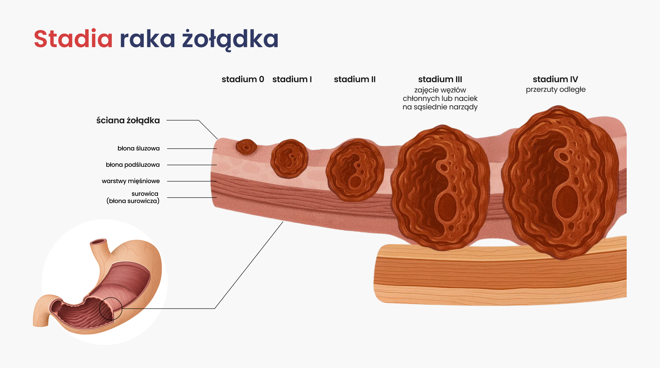 Po potwierdzeniu obecności nowotworu w badaniu histopatologicznym konieczne jest określenie, jak bardzo choroba się rozprzestrzeniła. Ustala się wtedy stopień naciekania guza (głębokość), zajęcia węzłów chłonnych i obecności przerzutów odległych. Stopień zaawansowania raka żołądka określa się według systemu TNM, który uwzględnia: