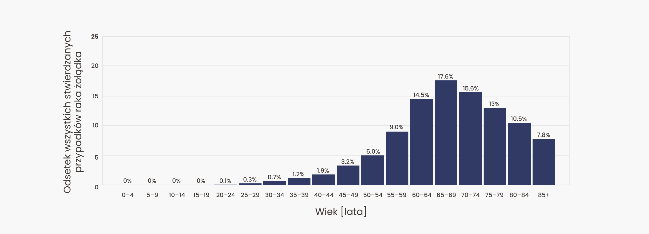 Rak żołądka to drugi pod względem częstości nowotwór układu pokarmowego w Polsce, tuż po raku jelita grubego. Mimo powolnego spadku liczby nowych przypadków choroba nadal najczęściej dotyka mężczyzn po 60. roku życia — niemal 80% zachorowań diagnozuje się w tej grupie. Dla osób do 40. roku życia ryzyko jest bardzo niskie, a całkowite prawdopodobieństwo zachorowania w ciągu życia wynosi ok. 1,7%. Świadomość zagrożenia i proste zmiany w codziennym stylu życia, jak zdrowa dieta czy regularne badania, mogą realnie zmniejszyć ryzyko zachorowania.