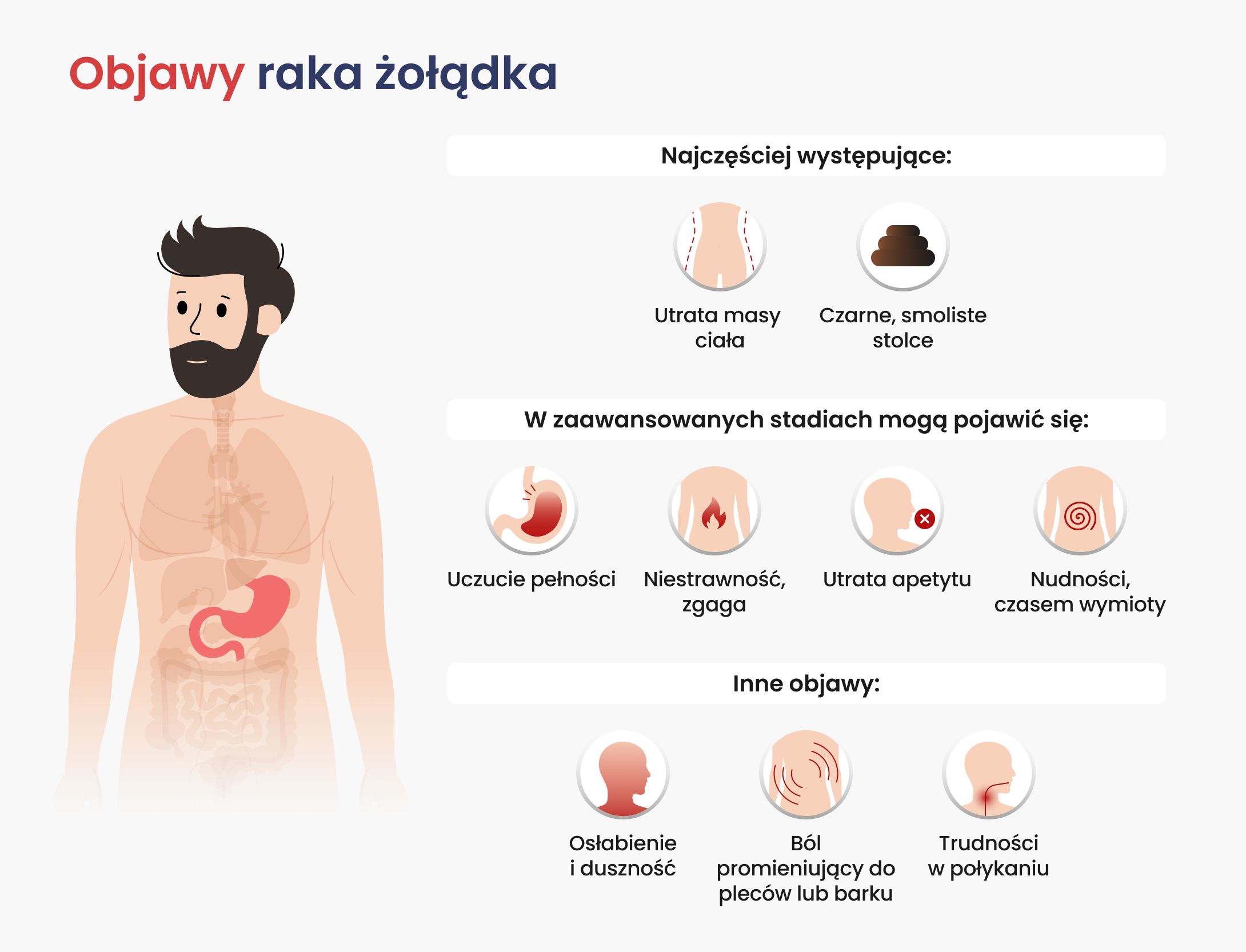 Rak żołądka we wczesnych stadiach zwykle nie daje żadnych charakterystycznych objawów, dlatego bywa trudny do wykrycia. Czasem jest zauważany przypadkowo, np. podczas gastroskopii wykonywanej z powodu zgagi czy bólu brzucha. Typowe objawy choroby z powodu nowotworu pojawiają się dopiero w zaawansowanym stadium i mogą przypominać mniej groźne dolegliwości. Warto je znać i nie lekceważyć, szczególnie jeśli utrzymują się przez dłuższy czas lub nasilają stopniowo.