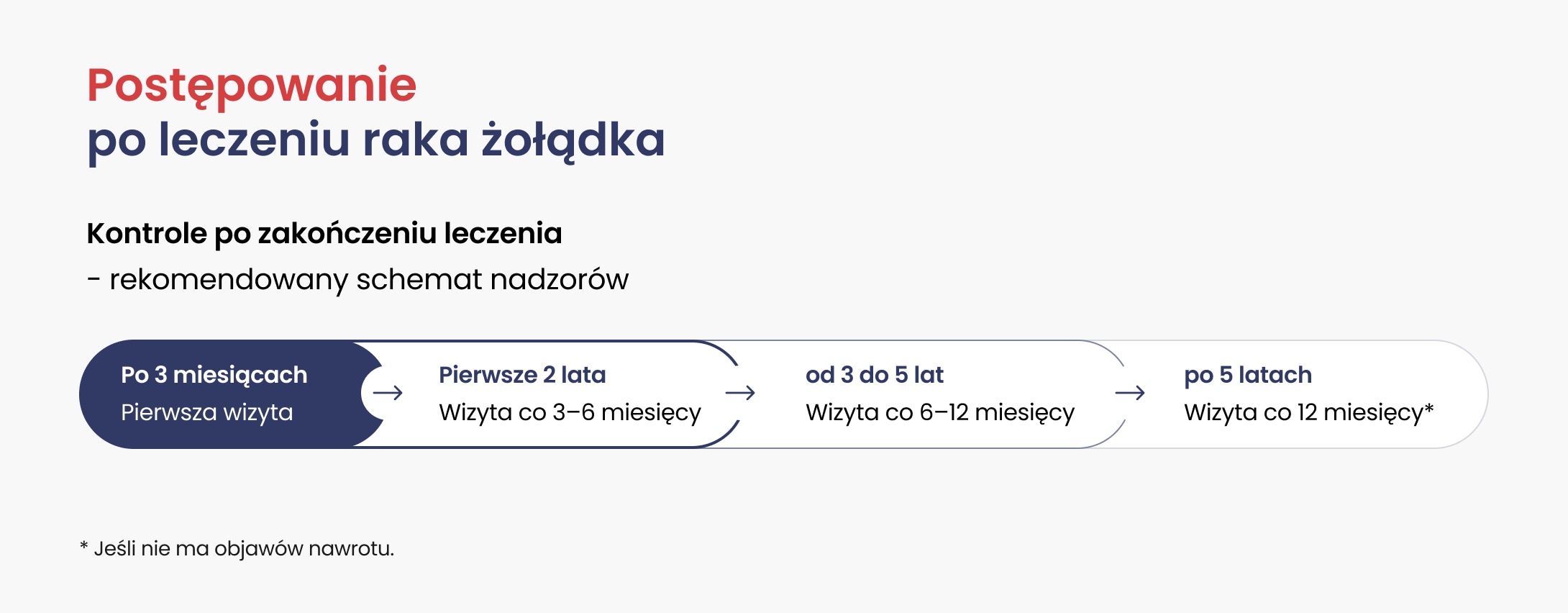 Po zakończeniu leczenia raka żołądka ważne jest systematyczne monitorowanie zdrowia. Plan kontroli ustala się indywidualnie, w oparciu o stopień zaawansowania choroby, typ nowotworu oraz zastosowane leczenie. Celem obserwacji po wyleczeniu jest wczesne wykrycie nawrotu choroby oraz monitorowanie ogólnego stanu zdrowia pacjenta.