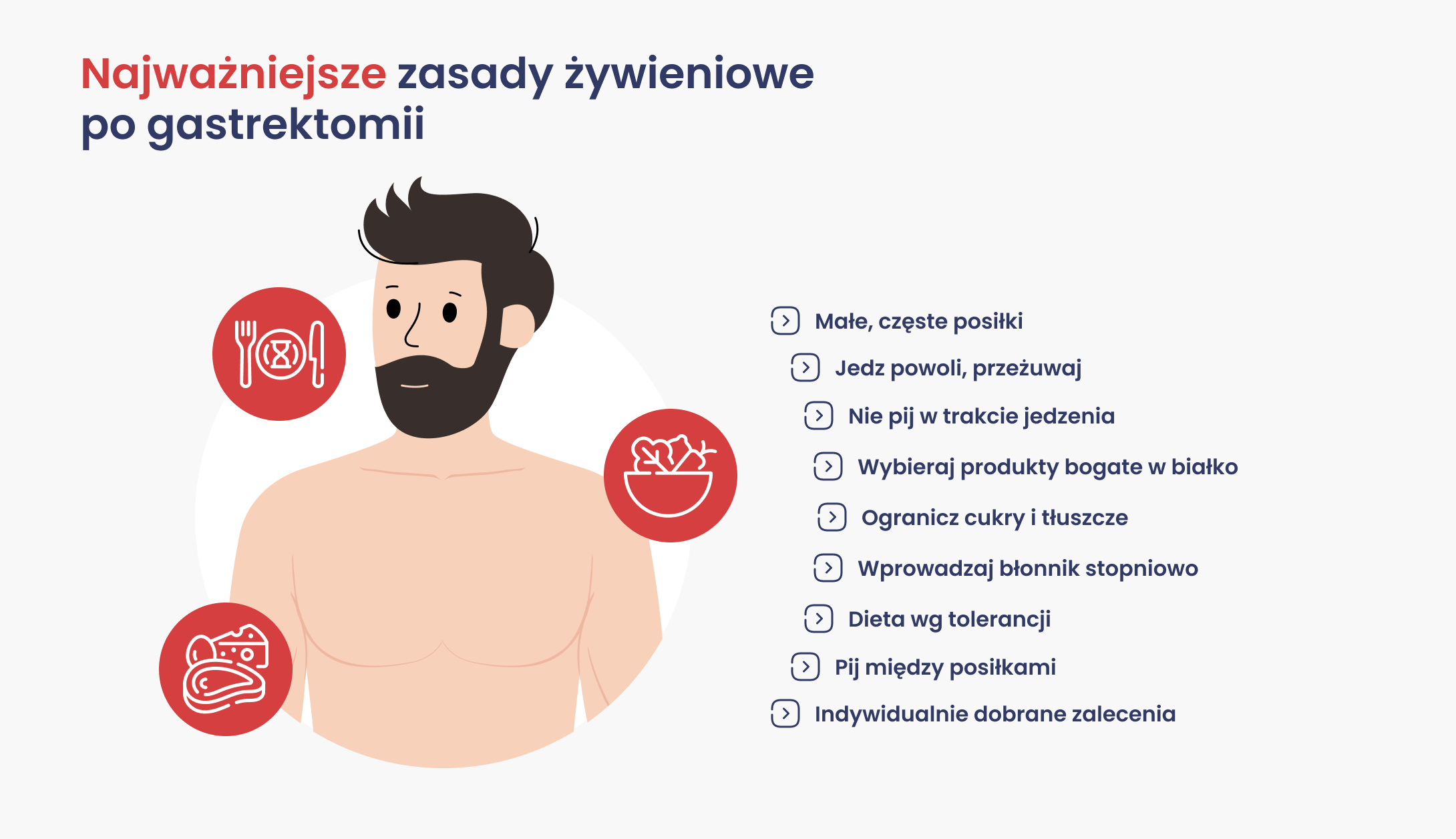 Po częściowym lub całkowitym usunięciu żołądka przewód pokarmowy funkcjonuje inaczej niż przed operacją. Zmniejszona jest pojemność żołądka, pokarm nie jest już w nim magazynowany, lecz szybciej trafia do jelita cienkiego. Dlatego zaleca się spożywanie mniejszych posiłków i jedzenie częściej, nawet 5–7 razy dziennie. Często występują trudności z trawieniem niektórych pokarmów, szczególnie tłustych, bardzo słodkich lub ciężkostrawnych. Wielu pacjentów wymaga suplementacji, zwłaszcza witaminy B12 (najczęściej w zastrzykach), żelaza, wapnia i witaminy D. Wzrasta też ryzyko niedożywienia, dlatego ważna jest opieka dietetyka i regularne monitorowanie stanu odżywienia. Pacjent po gastrektomii wymaga indywidualnego podejścia dietetycznego, nauki nowych nawyków żywieniowych i regularnych kontroli lekarskich.